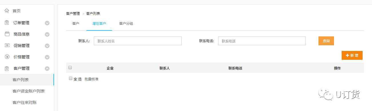 潜在客户是指有加盟意向的客户(U订货加盟事项请参看上期文章U订货招商加盟新法宝),在潜在客户中可新增、编辑、删除潜在客户。如下图所示: