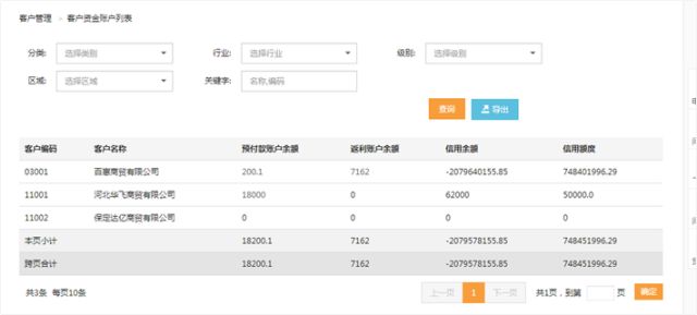 资金账户列表用于快速查看客户资金账户。可通过分类、行业、区域、级别、客户名称、客户编码等条件快速查询客户的资金账户,可导出客户资金账户列表,可查看客户的预付款账户余额、返利账户余额、信用余额、信用额度。如下图所示: