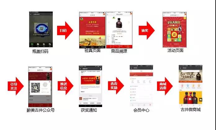 建立企业微商城,一瓶一码等移动终端应用:通过扫描瓶盖二维码,可以实现产品验真,商品溯源,查看促销,移动端会员营销等功能。