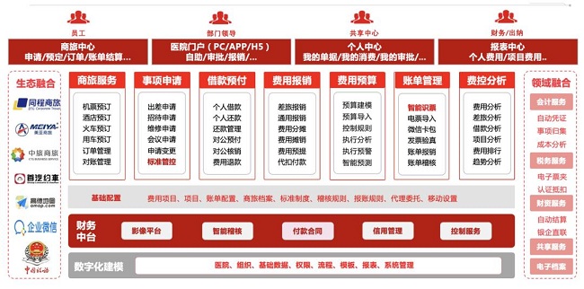 医疗机构的费控管理通常是指统一付款申请审批、结算业务,包括物资、设备采购付款,自有资金日常经费报销、科研、财政专项经费报销,差旅费,劳务津贴,薪资奖金发放等业务。从信息化层面来看,要支撑上述业务的费控管理,涉及到物资系统、预算系统、财务系统、合同系统、人力资源系统、OA系统、影像管理系统等多种系统与模块的协同。